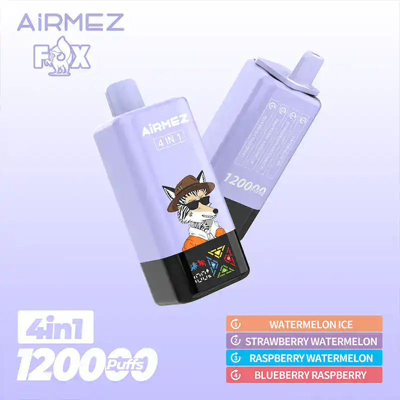 Experience the ultimate vaping with Airmez FOX 4IN1 120k disposable vape device. Featuring 4 flavors in one device, 120000 puffs, advanced mesh coil technology, Type-C charging, and a clear screen display. Perfect for beginners and advanced vapers seeking long-lasting performance and rich flavor.