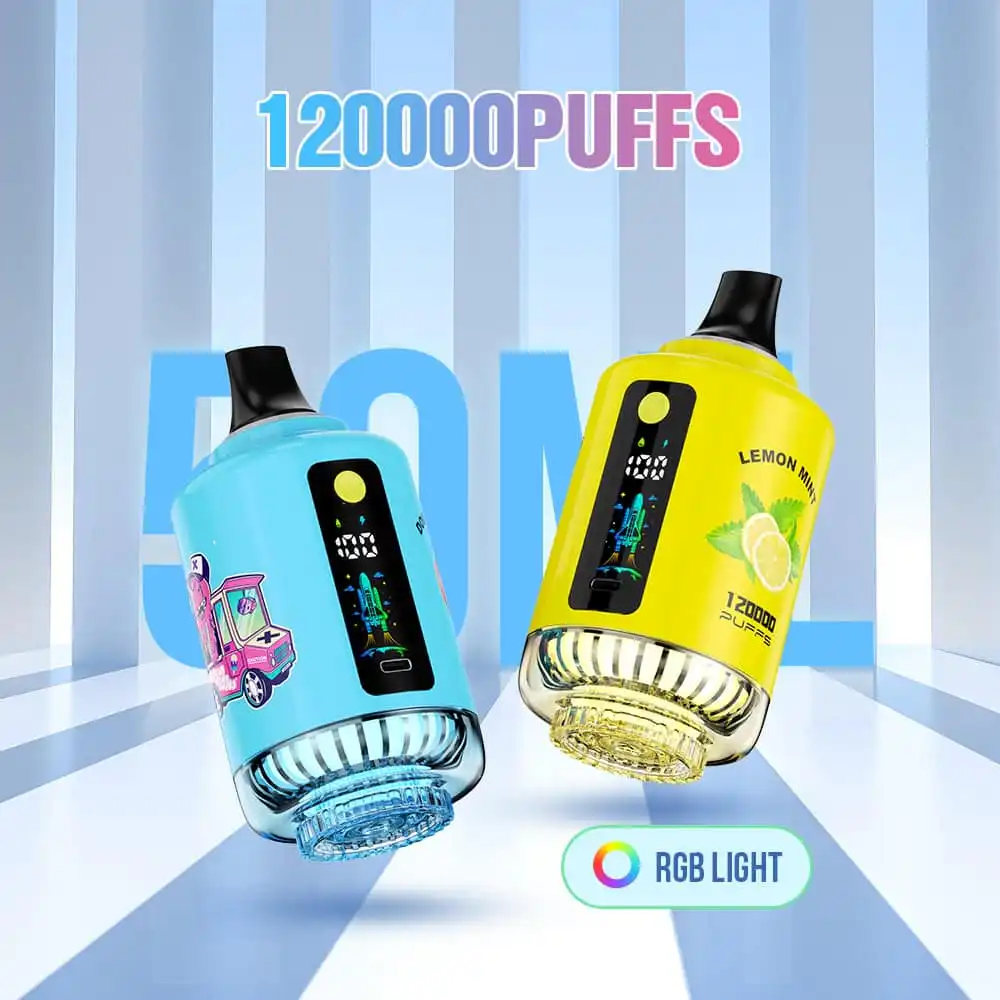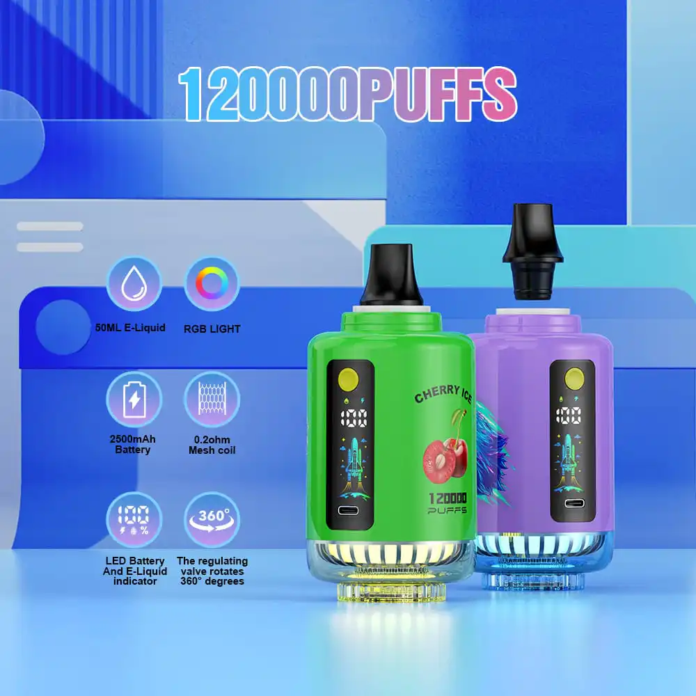 ATVS 120k puff disposable vape delivers unmatched longevity with 50mL e-liquid capacity and 2200mAh rechargeable battery. Featuring adjustable airflow control and premium E-Shisha head technology. Ideal for retailers and wholesalers seeking high-capacity disposable vapes with superior performance