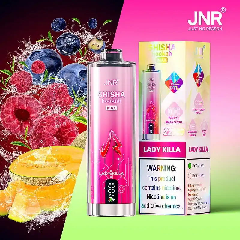 JNR Shisha Max 22K: Enjoy ~22,000 puffs from 29ml e-liquid! Features a flavor-boosting Triple Mesh Coil, 1100mAh battery w/ Type-C charging, clear Battery & E-liquid Level Displays, and Adjustable Airflow. Ultimate long-lasting disposable vape