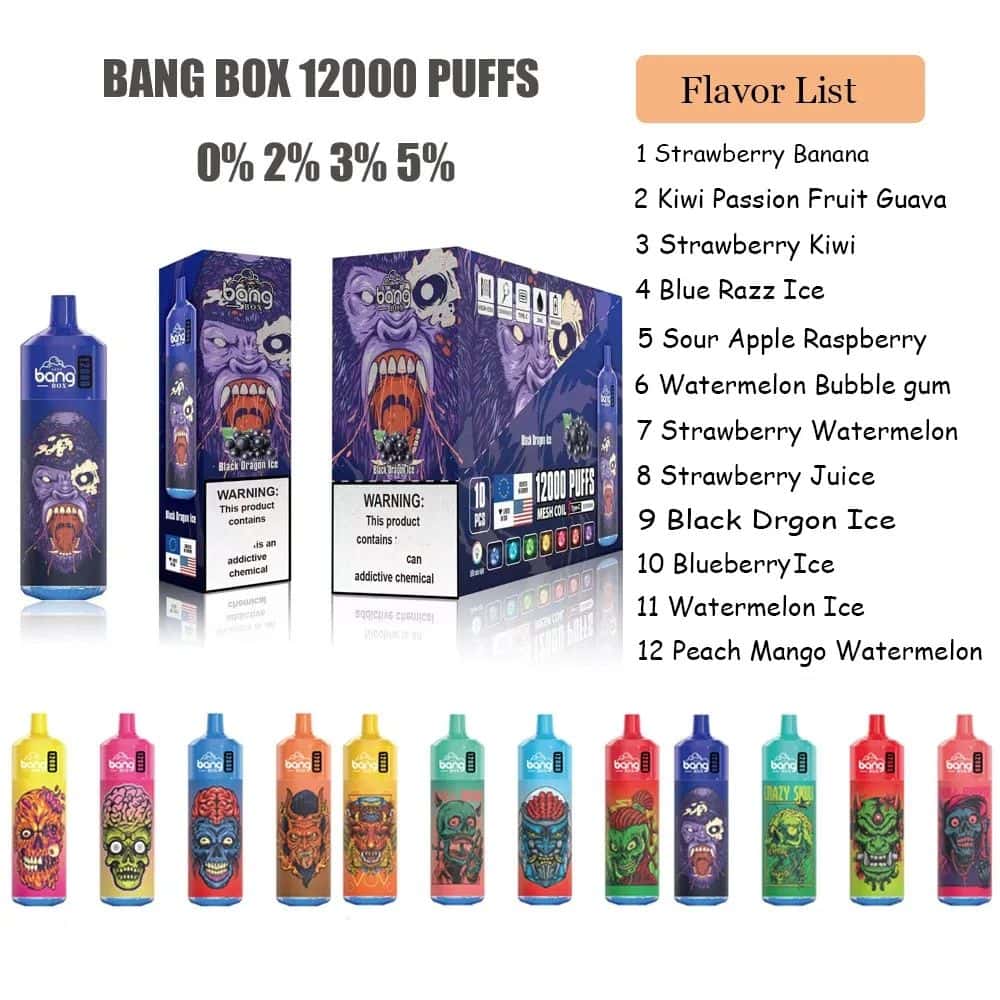 Bang Box 12k Puffs is disposable vape pod. The compact device has a built-in type-c rechargeable 600mAh battery and 15ml pre-filled salt nicotine e-juice that can power up to 12000 puffs, Mesh coil brings a pure flavor taste, enjoy the fantastic flavor from the very first puff to the last.