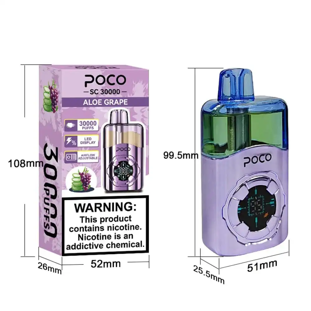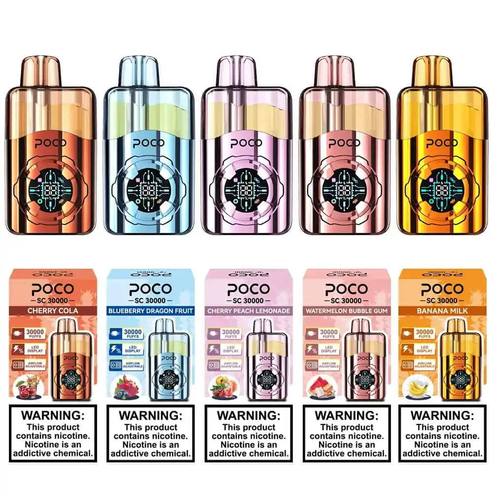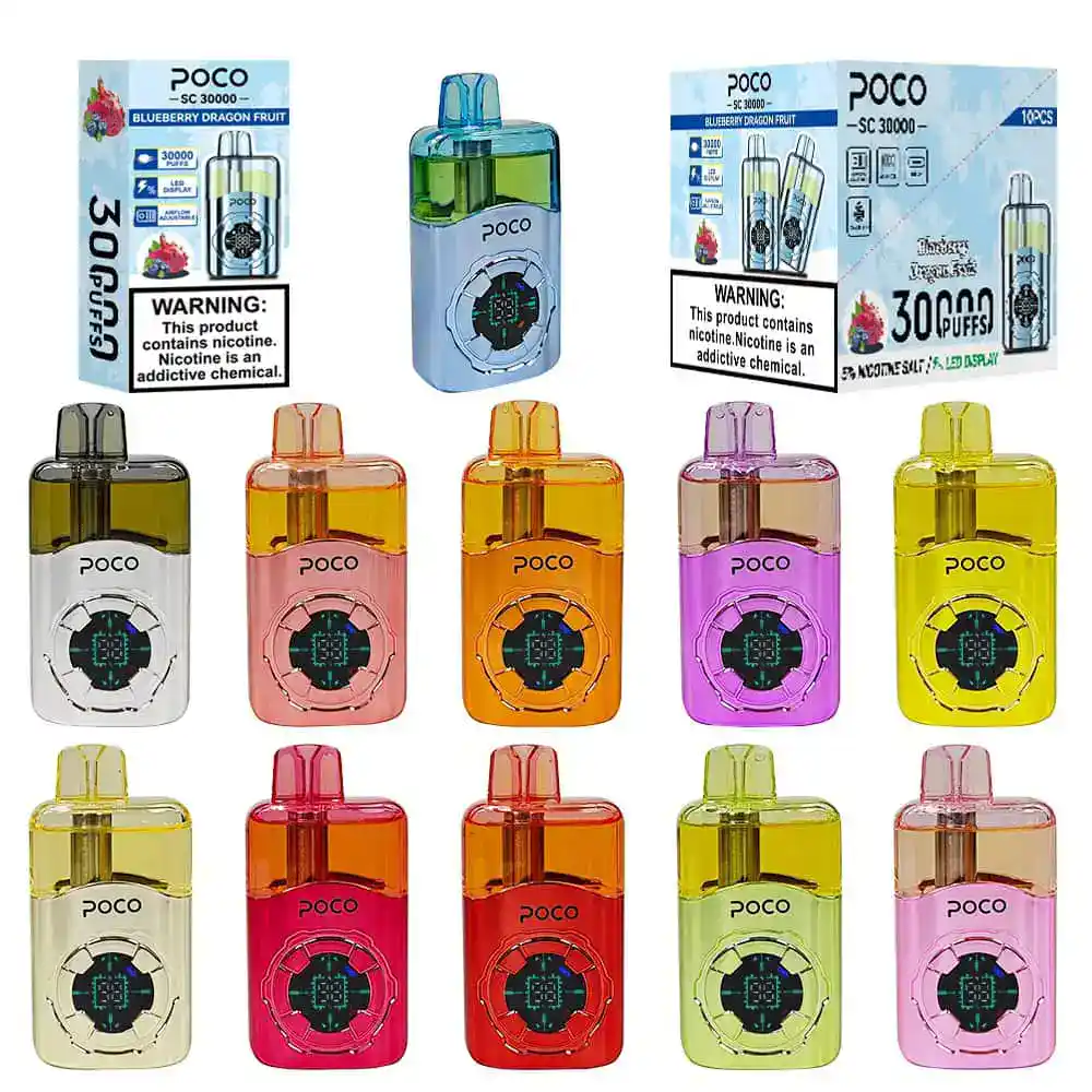 The POCO SC30000 Disposable Vape 30000 Puffs 30k is a high-performance disposable vape device designed for longevity and intense flavor delivery. With a massive 30mL pre-filled juice capacity and a powerful 650mAh battery rechargeable via Type-C port, it delivers up to 30000 puffs for long-lasting use. It features a advanced 0.7Ω mesh coil for superior vapor production and flavor consistency. The e-liquid contains 50mg (5%) nicotine salt for a smooth yet satisfying throat hit, available in 15 refreshing flavors. Each device is compact, weighing only 98g, making it highly portable. Packed 10 pieces per pack and 200 pieces per carton (CTN), it’s ideal for retailers and wholesalers.