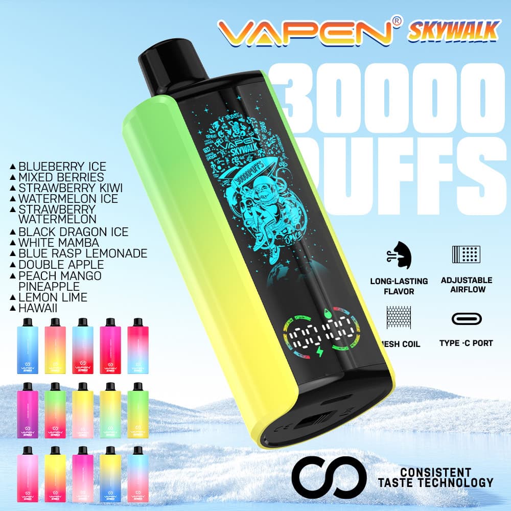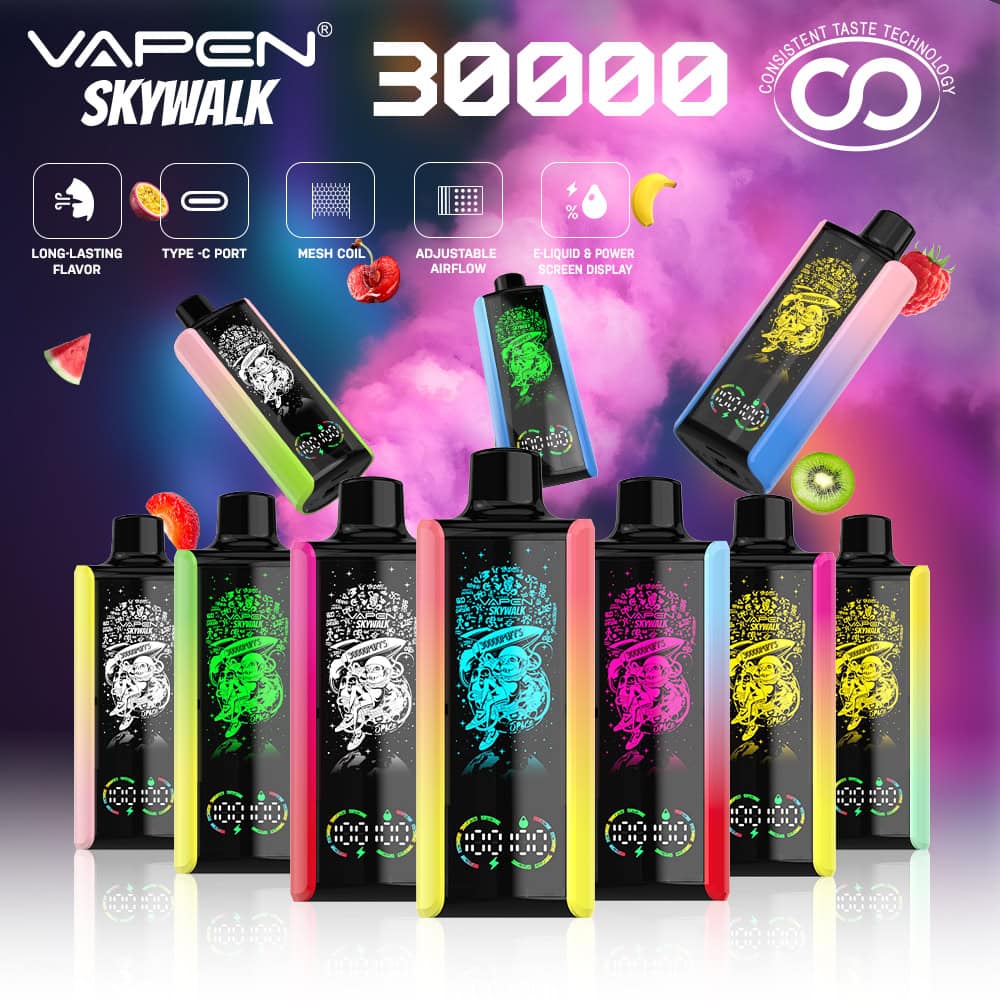 Vapen Skywalk 30000 puff is a stylish disposable vape featuring a 30ml e-liquid capacity and a huge puff count of 25,000 puffs. With a 650mAh battery