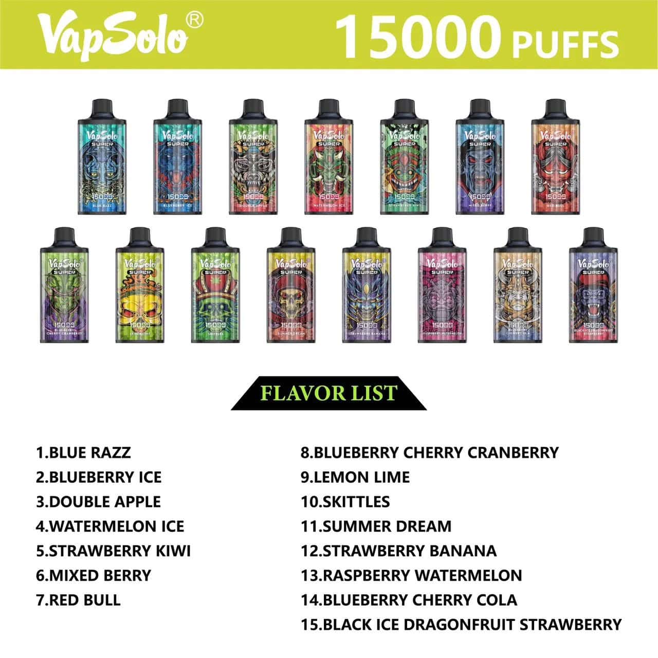 The Vapsolo Super 15000 Puffs from vivivapes is a premium, rechargeable disposable vape offering up to 15,000 puffs with 2% or 5% nicotine options, a 650mAh battery, 25ml e-liquid capacity, and a variety of rich flavors, perfect for wholesalers and retailers seeking high-quality vaping products.