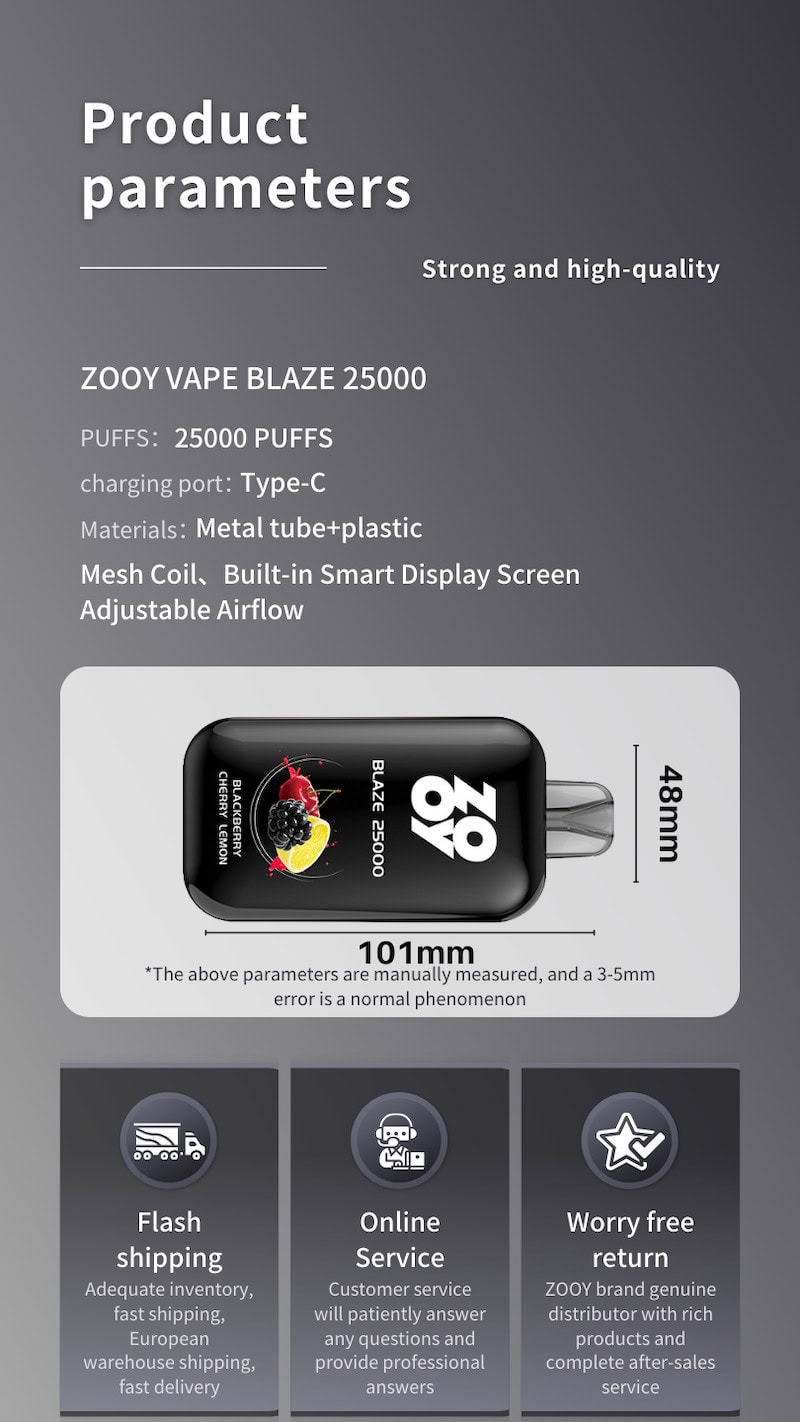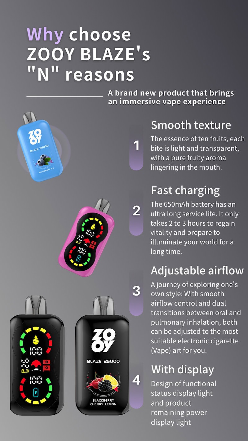 Experience the exceptional benefits of ZOOY Vape Blaze 25k. With its massive 25000mAh battery capacity, enjoy extended vaping sessions without worrying about frequent recharging. The sleek and ergonomic design ensures a comfortable grip, making it perfect for on-the-go vaping. The advanced airflow system guarantees smooth and satisfying clouds, while the adjustable wattage settings allow for a personalized vaping experience. Embrace the power and versatility of ZOOY Vape Blaze 25000 and indulge in a vaping journey filled with convenience, performance, and pure satisfaction.